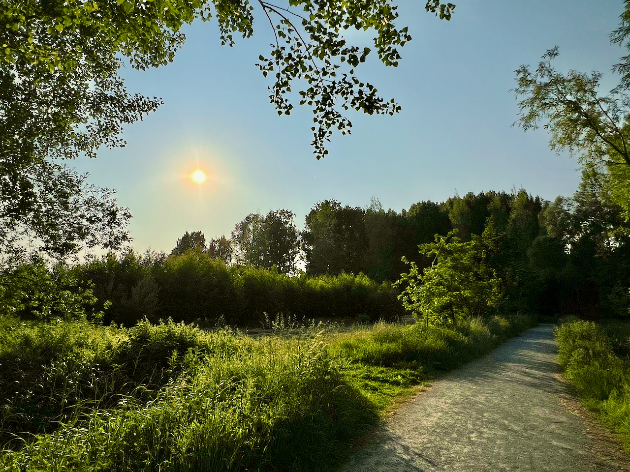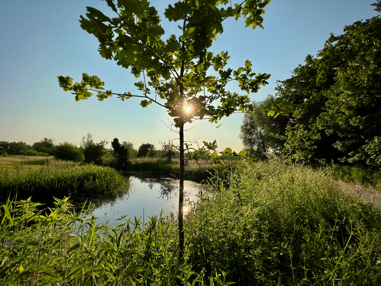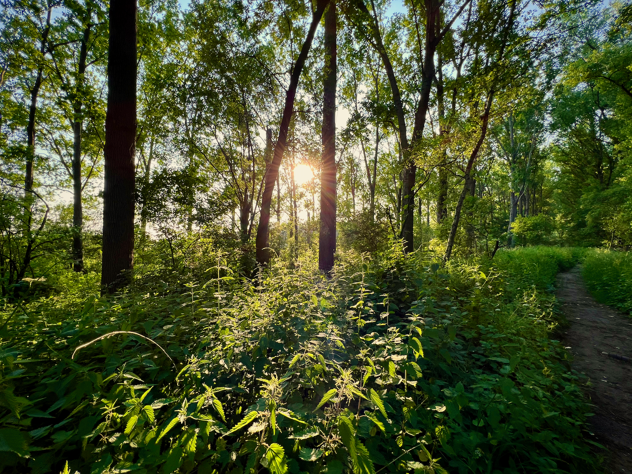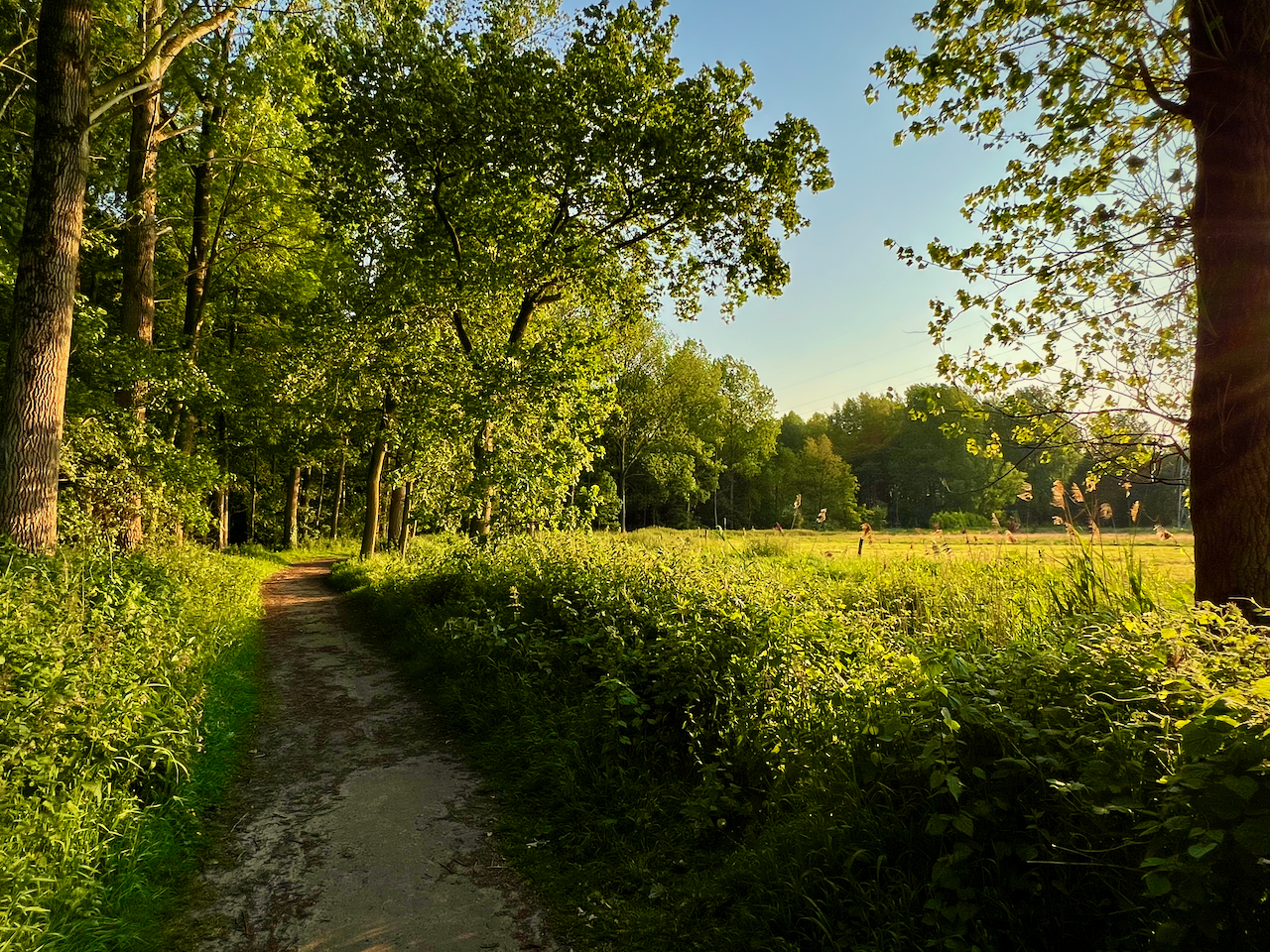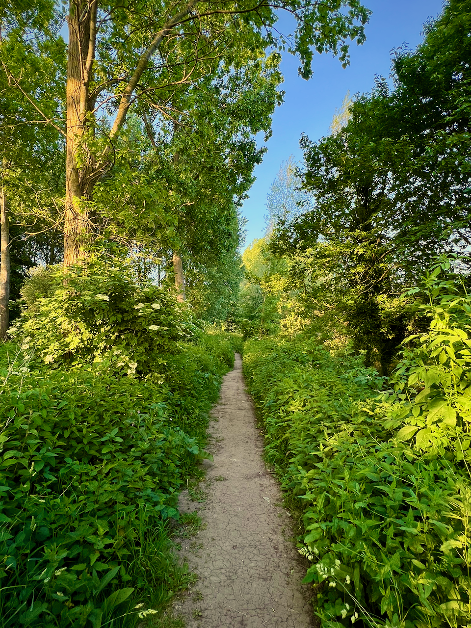 De Vinderhoutse bossen, hoewel vernoemd naar een deelgemeente van Lievegem, bevinden zich eveneens voor een stuk op Gents grondgebied. Er zijn verschillende wandelroutes, maar op die warme bijna-zomeravond koos ik de Leeuwenhof of de rode wandeling van Natuurpunt uit, met haar 4 km de kortste route. De start aan voormalig jeugdhuis Chez Choseken in Drongen oogde wat ‘vergane glorie’, maar daar dacht ik al niet meer aan van zodra ik het bruggetje naar het grindpad naast het bos was overgestoken.