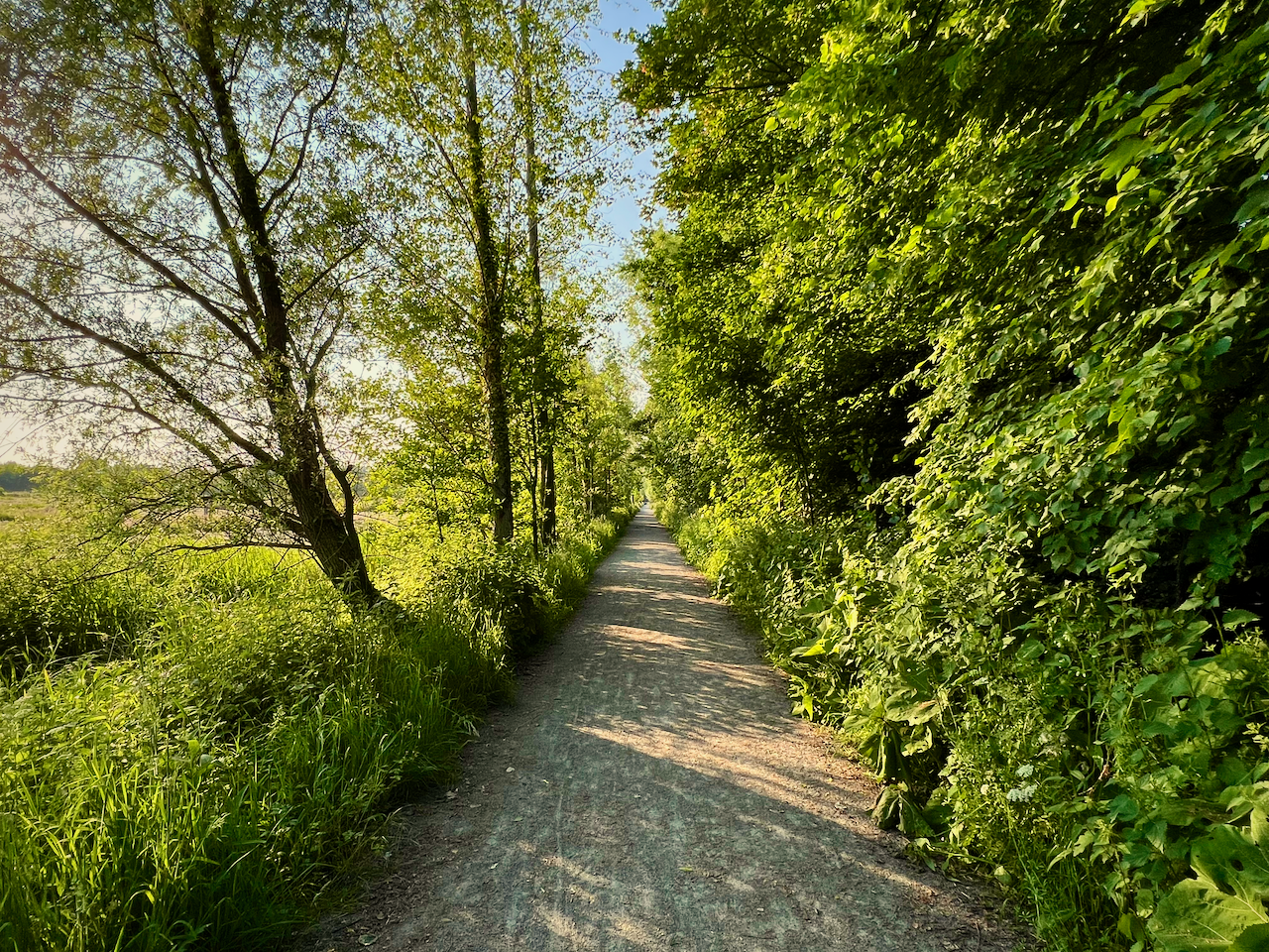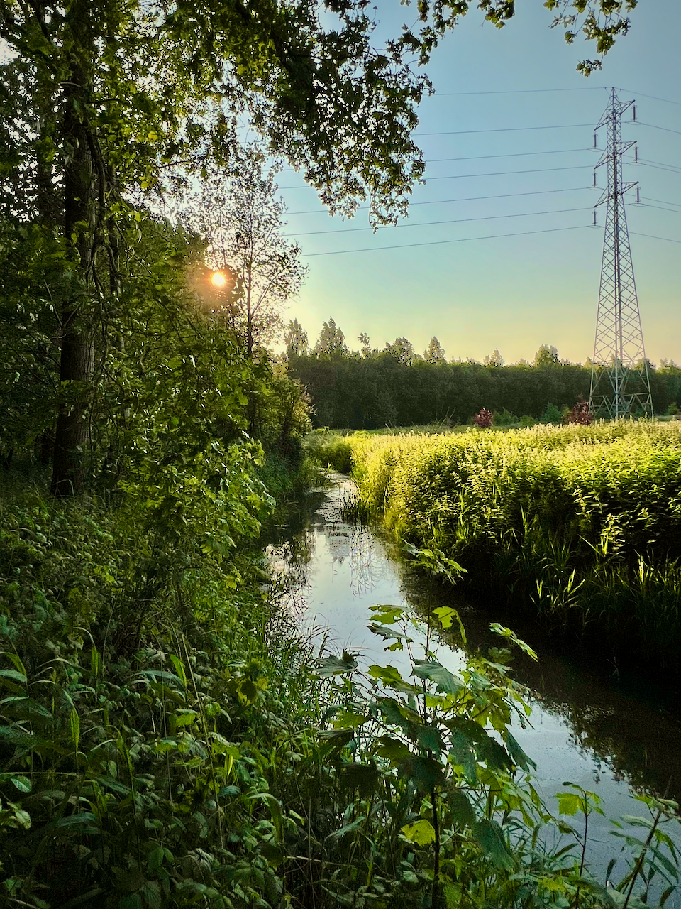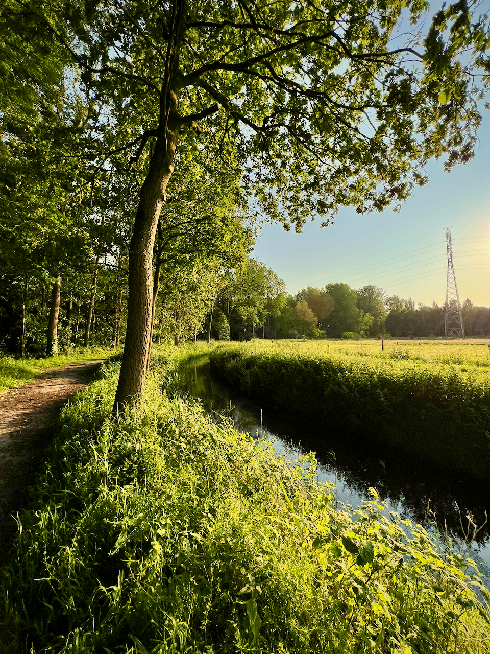 Van keurig grindpad, over graspad, naar avontuurlijk bospad. ’s Winters kan het hier naar het schijnt erg drassig liggen omdat het bos dan grotendeels overstroomd is. Dat is natuurlijk nu niet het geval. Hoogspanningsmasten herinneren hier en daar aan de beschaving, maar echt storend wordt het niet. Ook de geluidsoverlast van de zéér nabije R4 vond ik redelijk beperkt (al kan dat in andere seizoenen of weersomstandigheden uiteraard wel anders zijn).