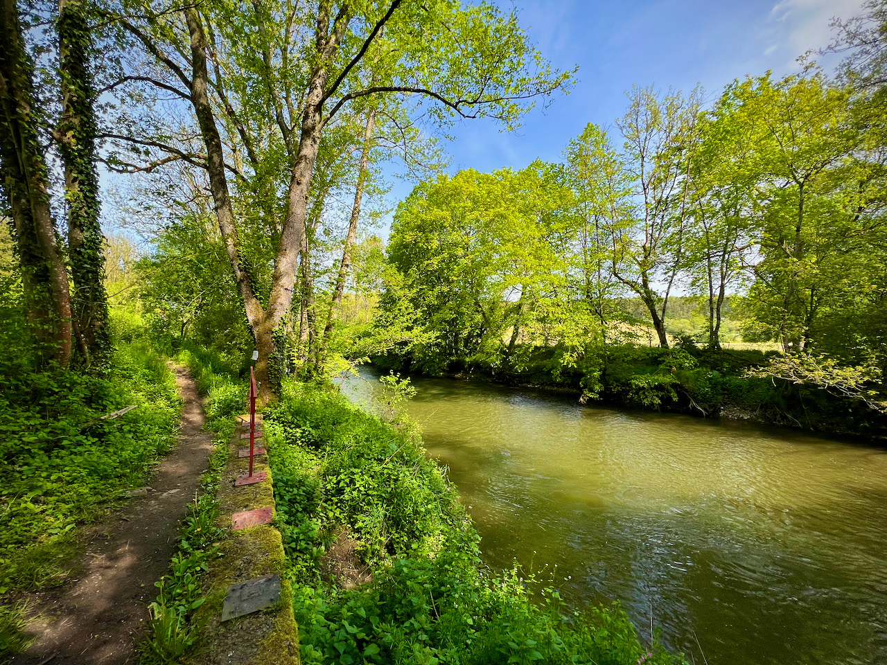 Eens voorbij het gemeentepark — ik stapte langs boven, maar je kan ook naast het water wandelen — gaat het verharde pad over in een aardeweg. Een oud fabrieksgebouw markeert vervolgens de overgang naar de échte natuur: la réserve naturelle de Dourbes.