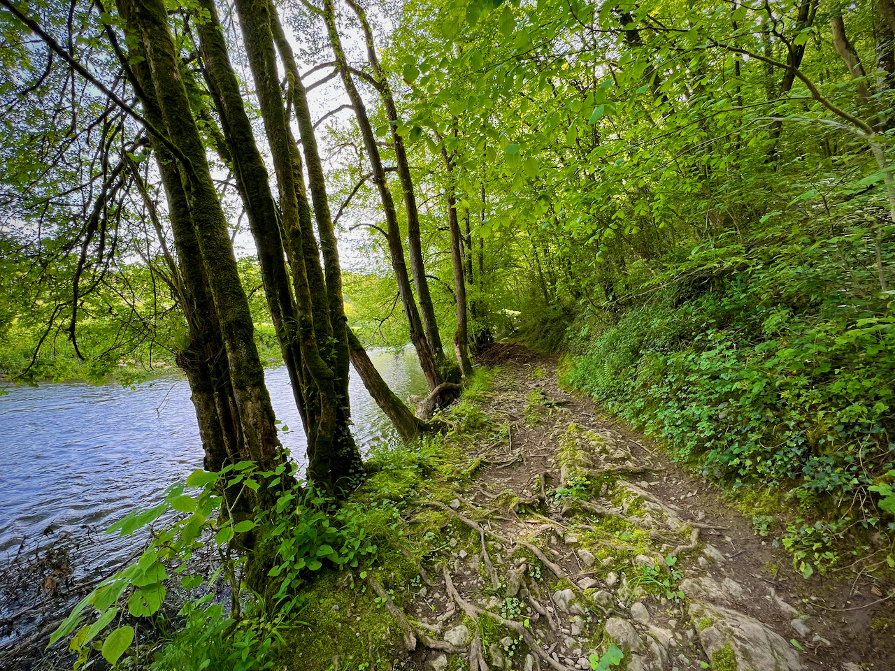 Hier en daar verspert een omgevallen boom de weg en moet je even klauteren of bukken, maar echt lastig is dat nooit. Het zwaarste stuk van de wandeling is een pittige klim ongeveer halfweg op de Roche à Lomme, één van de kalkstenen rotsformaties waarvoor deze streek bekend staat. Pfiou! De hele wandeling is voor zo’n 21 % verhard en telt 135 hoogtemeters. Ik had onderweg een omwegje kunnen maken naar la Roche aux Faucons, maar ik besloot mijn krachten te sparen voor le Fondry des Chiens. Onderweg zag ik trouwens wegwijzers voor de Santiago de Compostela …