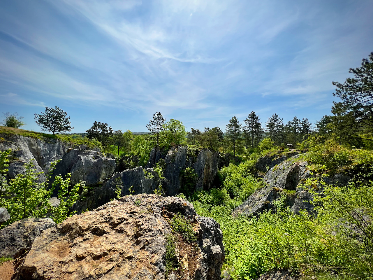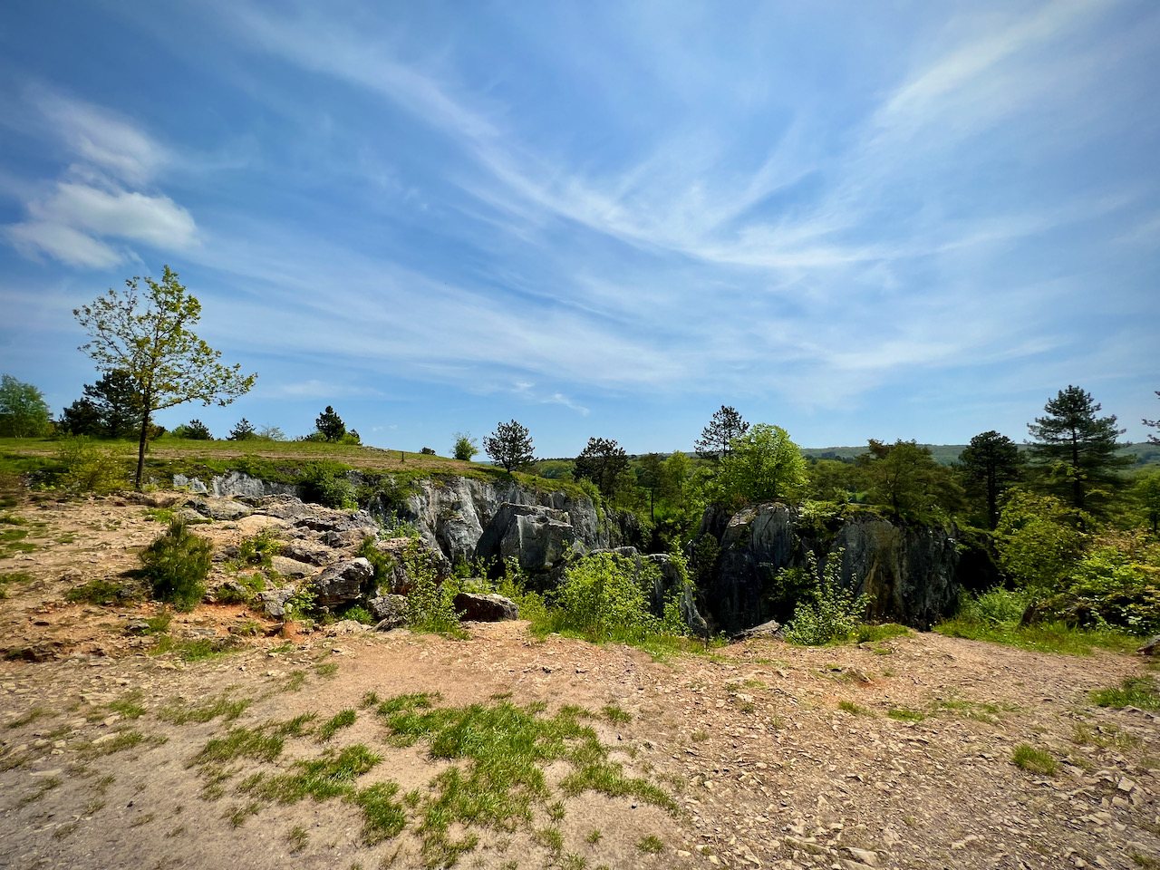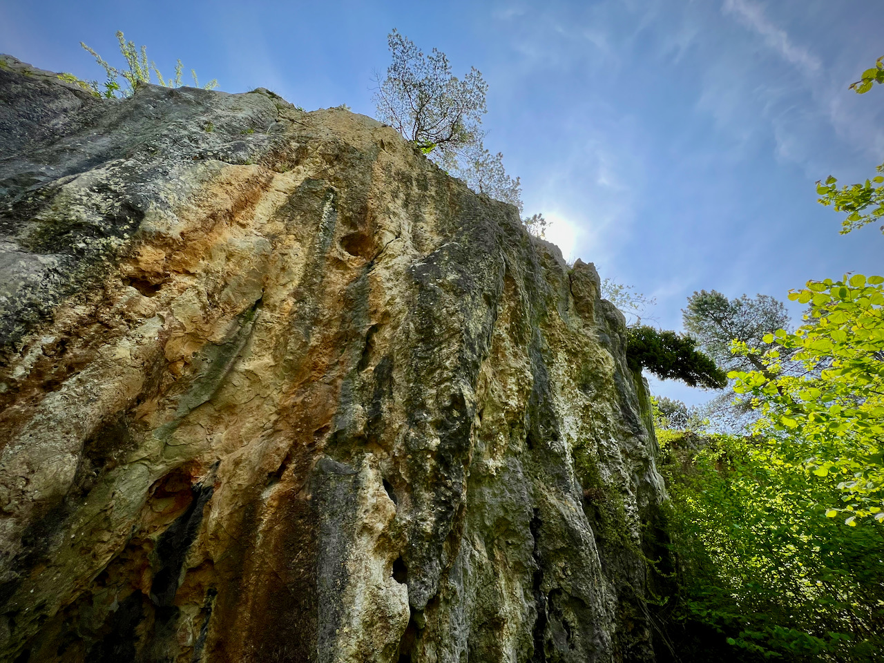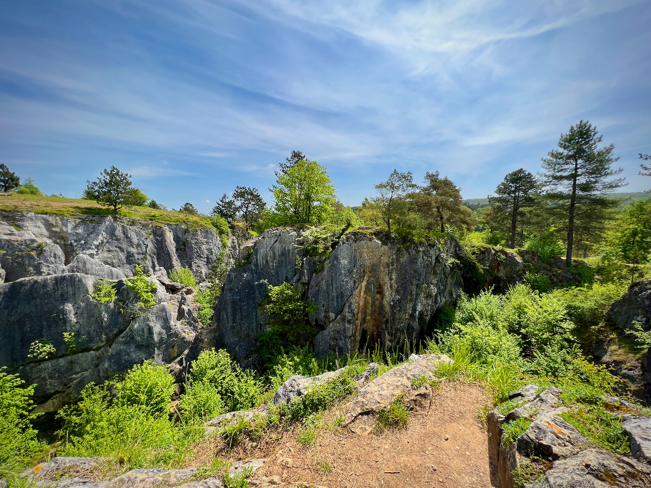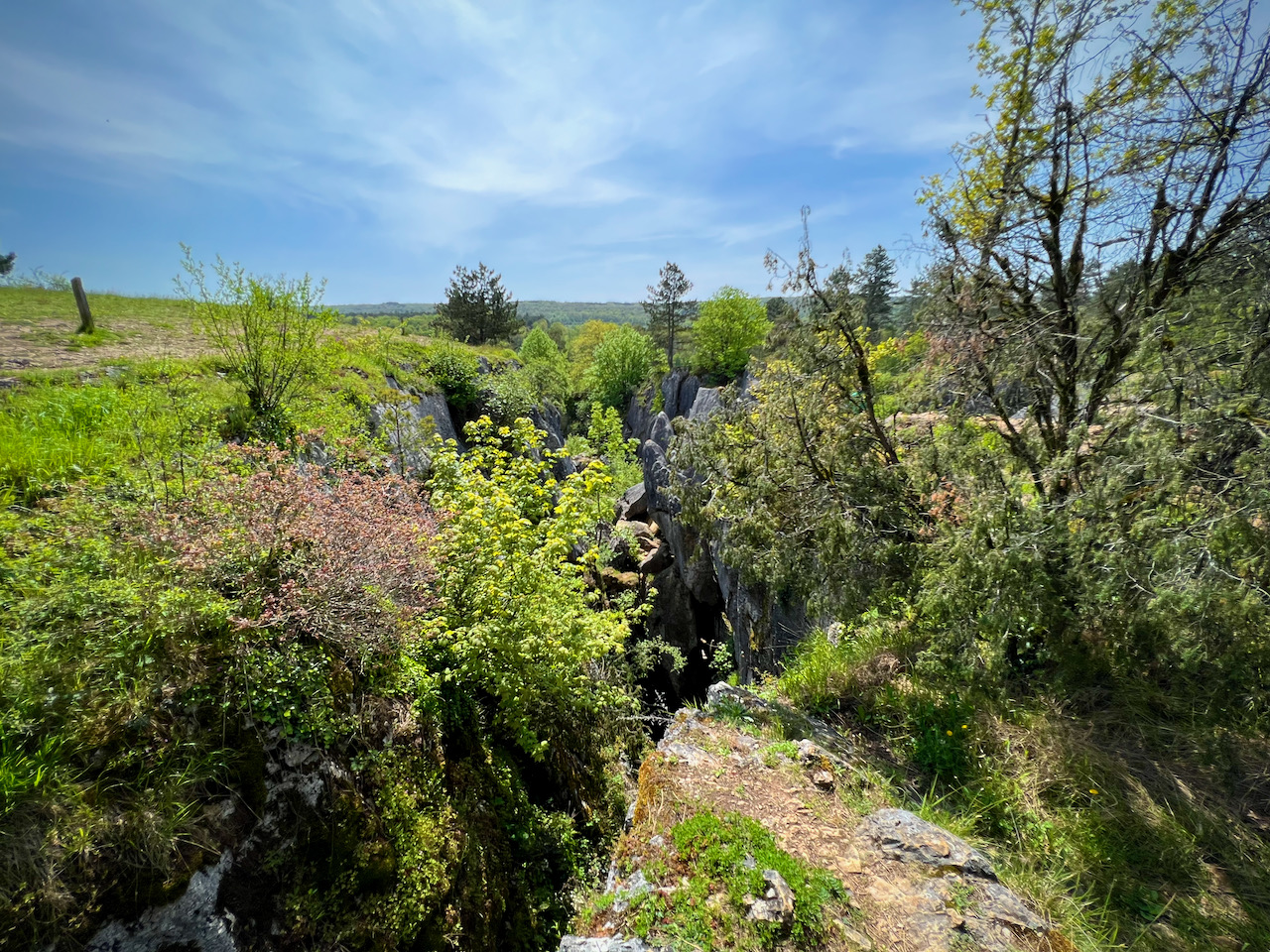 Dat le Fondry des Chiens een populaire bestemming is voor wandelaars en natuurliefhebbers kon me op die feestdag niet ontgaan. Er zijn verschillende wandelpaden om de omgeving te verkennen en je kan zelfs (gratis en voor niets, op eigen risico) afdalen in de kloof. Dit kan vrij makkelijk langs een ruw uitgehouwen trap, al zag ik sommigen ook langs de rotsblokken naar boven en beneden klauteren. Ik vond het een unieke ervaring om de steile rotswanden hoog boven me te zien uittorenen, maar het uitzicht was net iets spectaculairder van bovenaf gezien.
