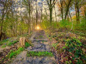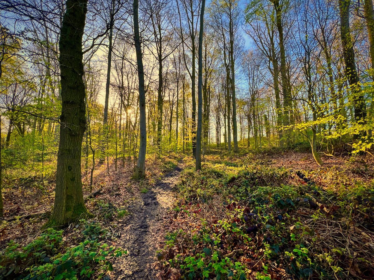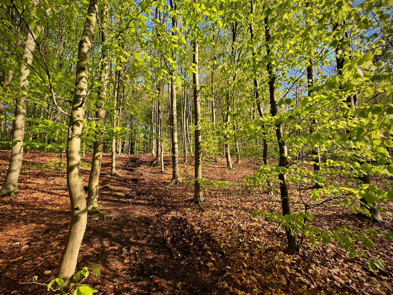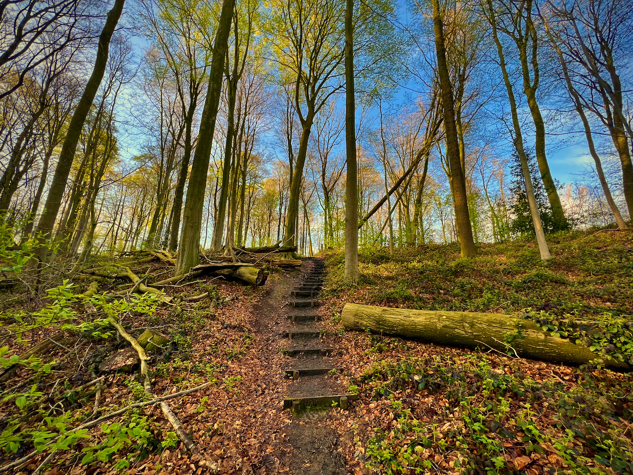 Hoe de Koppenberg zo lang van mijn wandelradar kon blijven, ik heb er géén verklaring voor. Toen ik op zoek was naar een niet al te lange wandeling die ik nog snel voor het weer zou omslaan kon maken, vond ik deze suggestie op Routen. Met 168 hoogtemeters scheert de route hoge toppen en dat is ook zo in figuurlijke zin. De weg is voor 32 % verhard, maar dat zijn in hoofdzaak steile, vaak holle plattelandswegen. Het grooste deel van de wandeling leg je af via heuvelende paadjes; slechts één keer kom je in de buurt van een drukke verkeersas, dit slechts heel kort. De paden in het bos zijn steil — wat had je verwacht — en kunnen er drassig bijliggen. Hier en daar helpt een trapje met klimmen of bieden enkele houten balkjes wat houvast.