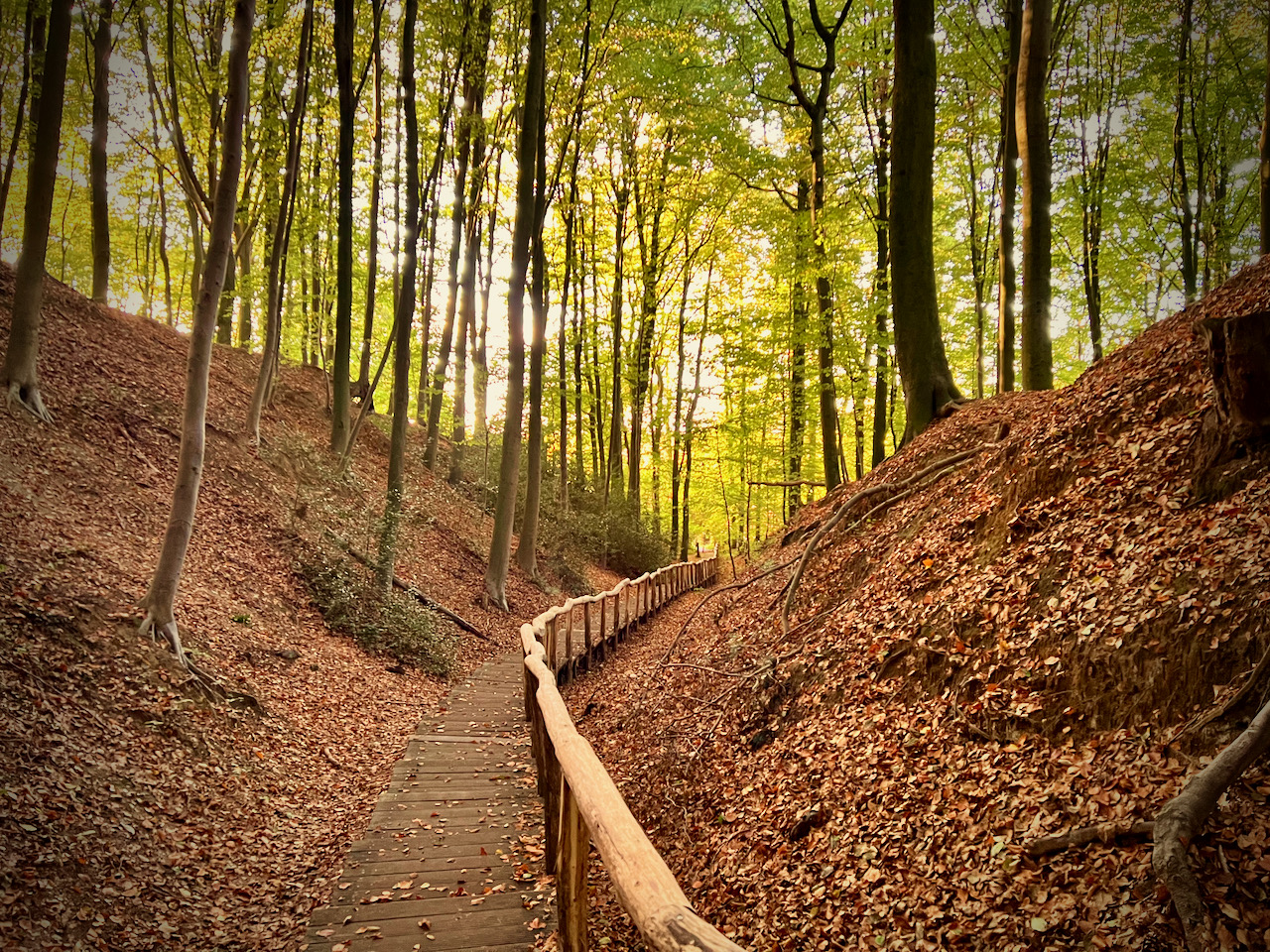Het diep ingesneden Berchembos vond ik gewéldig mooi en ook het Neigembos kon mijn verwachtingen moeiteloos inlossen. Ik hou van bossen met ‘woud-allures’ en die bezat het Neigembos — toch alvast niet in dit seizoen — mijns inziens niet. De steile hellingen en uitgeholde wegels, het prachtige plankenpad waarvoor ik even van de route moest afwijken en op de koop toe enkele stevige kuitenbijters compenseren echter moeiteloos dat gemis.