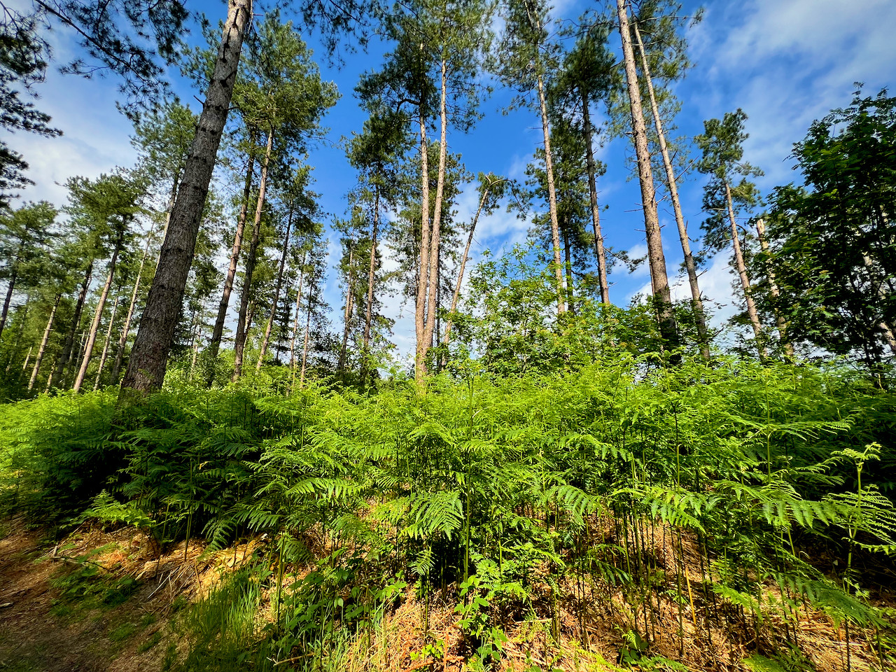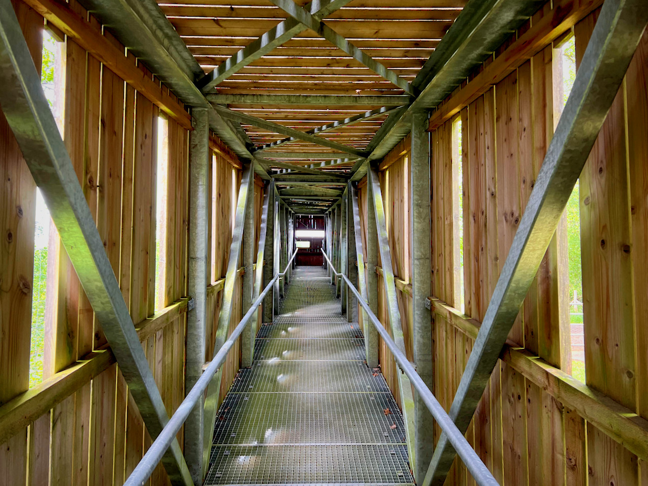 Hoewel je op de ‘Langs bos en hei’ wandelroute langs keurige bosdreven wandelt — die hebben trouwens allemaal een naam — en hier en daar een hei doorkruist, wandel je vooral ook letterlijk rónd Kamp Vloethemveld en het stiltegebied. Ik geef toe dat ik best wel nieuwsgierig was naar wat er binnen de omheining allemaal te beleven viel, maar gelukkig boden de Waterhut en verderop de Heidetoren soelaas. De fraaie Waterhut gunt je een blik op een grote vijver middenin het voormalige militair domein en wie weet spot je wel een bijzondere vogelsoort. Idem vanop de al even spectaculaire Heidetoren, maar daar sta je 6 meter boven de grond. Het infobord op de toren geeft bovendien een interessante simulatie weer van het domein van 1945 tot vandaag. De architectuur van de Heidetoren is gebaseerd op de wachttorens van het voormalige krijgsgevangenenkamp.