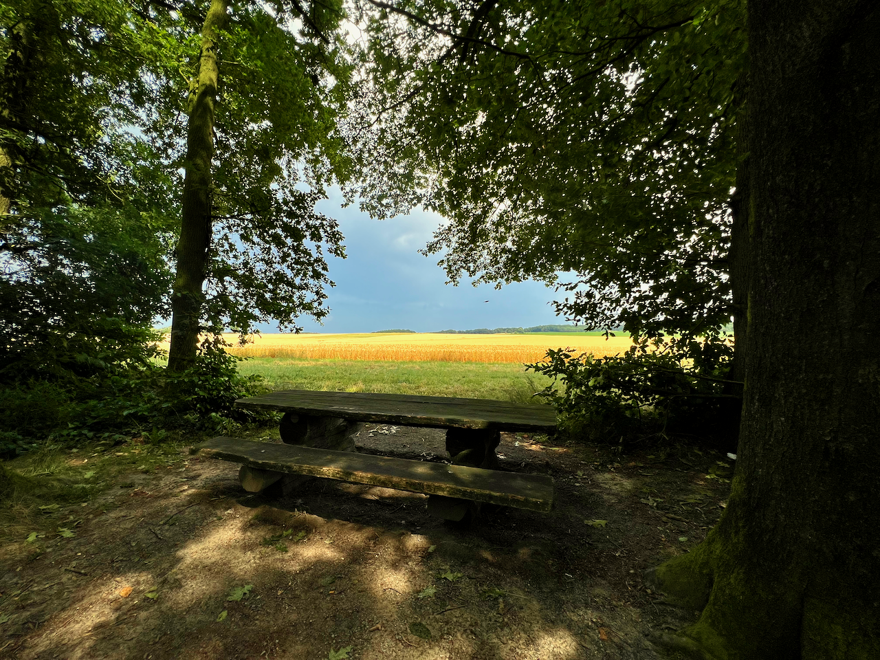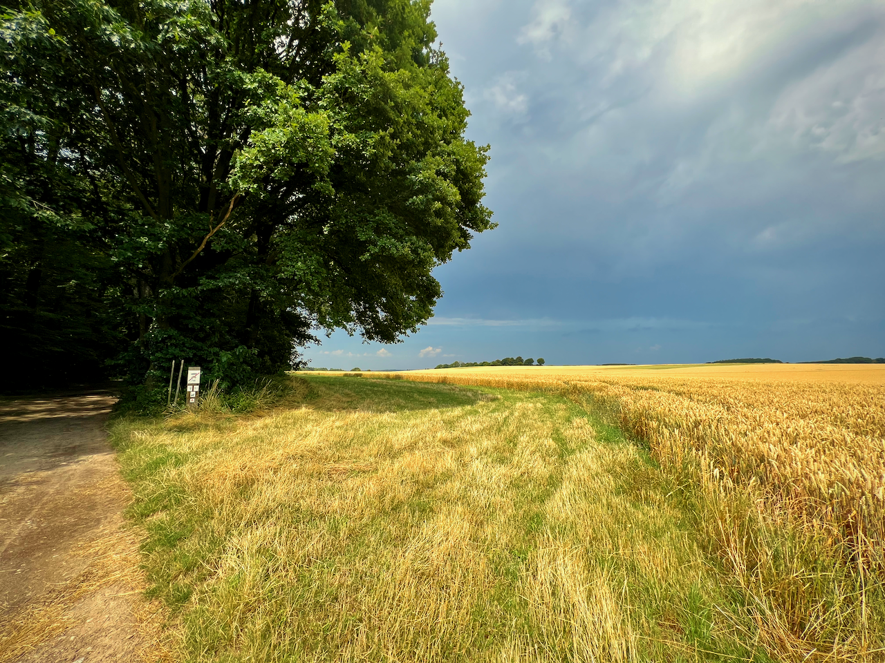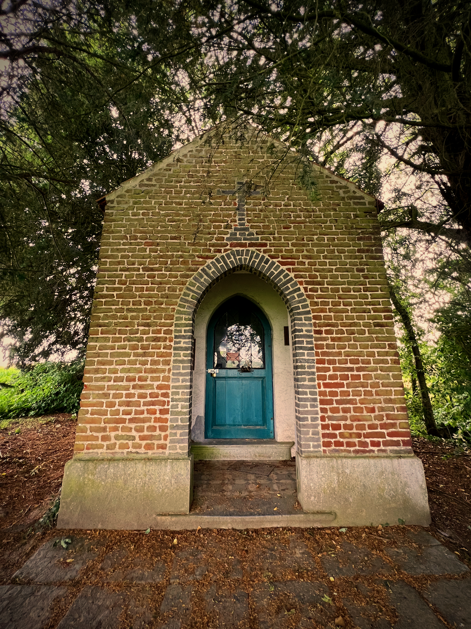 Toen de plensbui in alle hevigheid losbrak, overwoog ik even om ter hoogte van knooppunt 79 een shortcut naar KP 74 te nemen, maar dat kreeg ik niet over mijn hart. Gelukkig maar, want de holle weg in het verlengde van de Oude Geldenaaksebaan was ronduit prachtig en had zelfs nog een kleine verrassing in petto. Een stenen trapje lokte me naar de kapel van Sint-Bernardus. Deze is niet zo heel oud (1896), maar de bankjes voor het gebouwtje zijn ideaal om even tot rust te komen en het uitzicht op de velden is van hieruit fenomenaal.