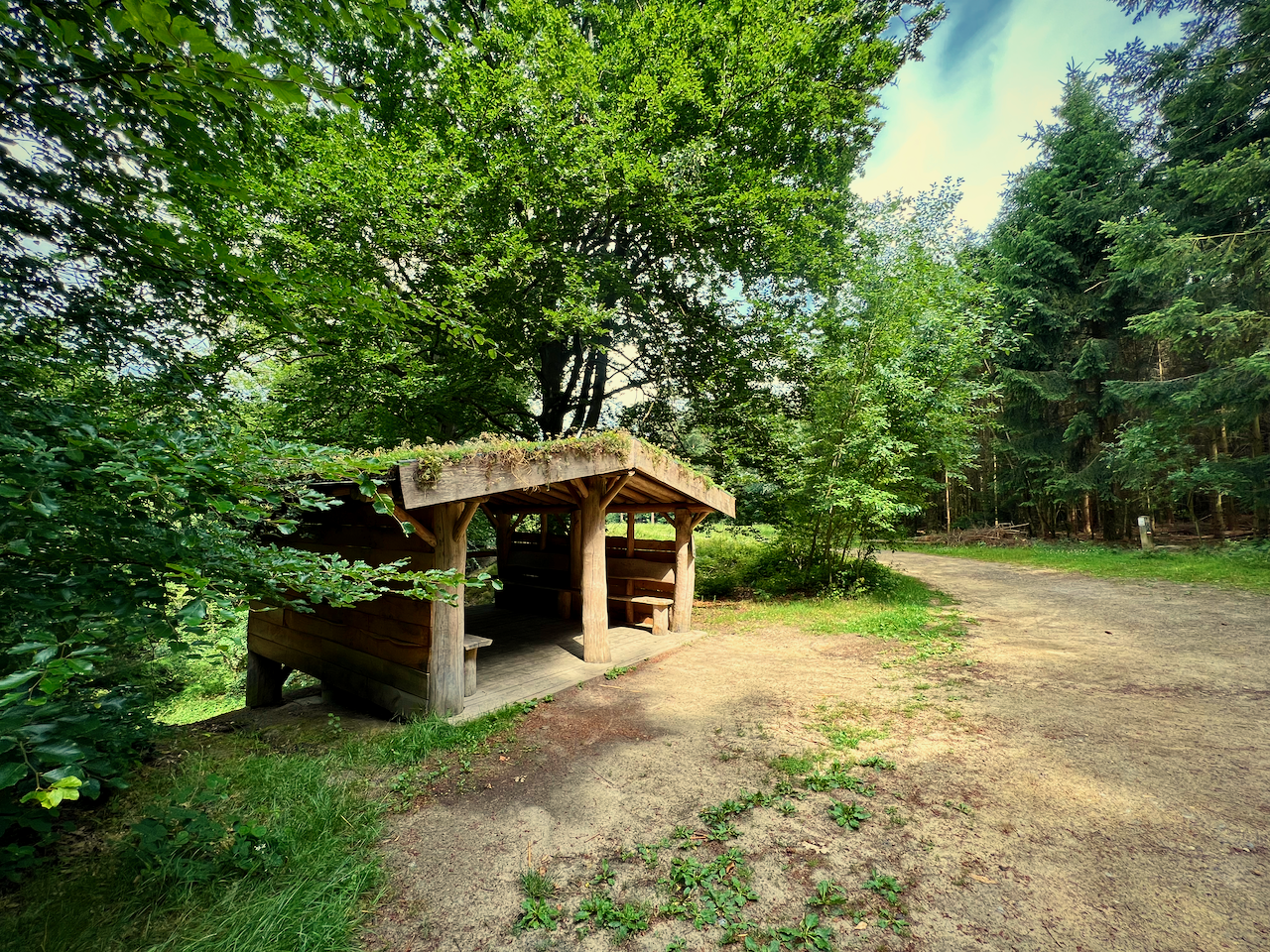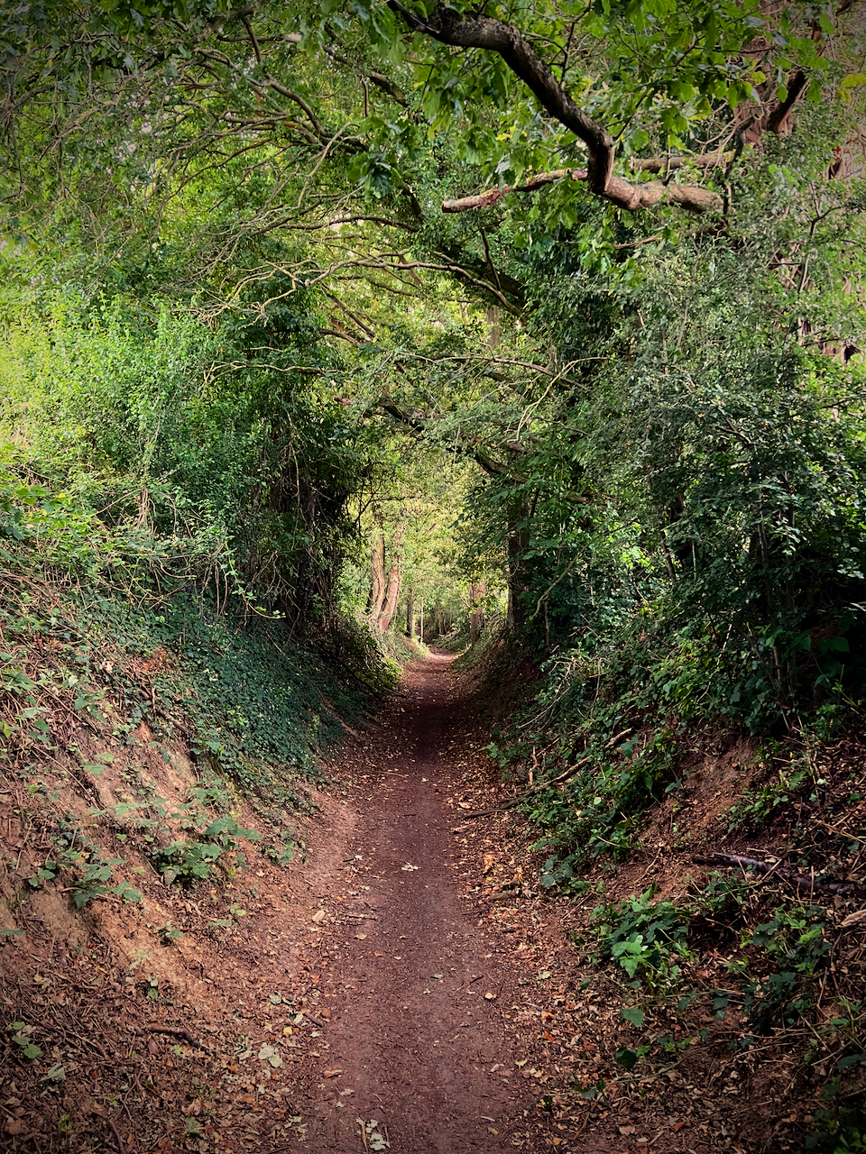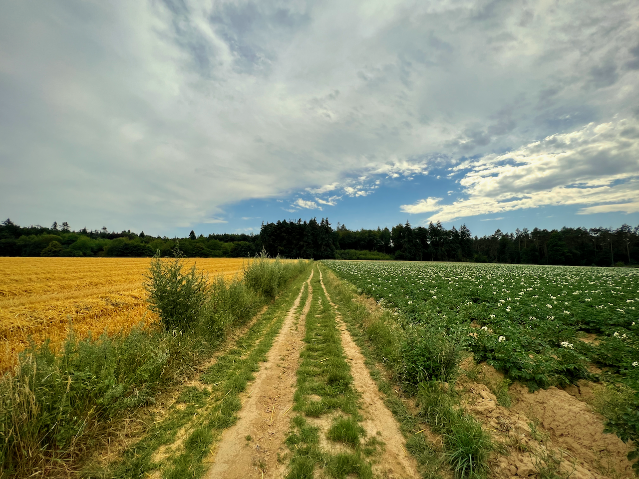 Toen de plensbui in alle hevigheid losbrak, overwoog ik even om ter hoogte van knooppunt 79 een shortcut naar KP 74 te nemen, maar dat kreeg ik niet over mijn hart. Gelukkig maar, want de holle weg in het verlengde van de Oude Geldenaaksebaan was ronduit prachtig en had zelfs nog een kleine verrassing in petto. Een stenen trapje lokte me naar de kapel van Sint-Bernardus. Deze is niet zo heel oud (1896), maar de bankjes voor het gebouwtje zijn ideaal om even tot rust te komen en het uitzicht op de velden is van hieruit fenomenaal.