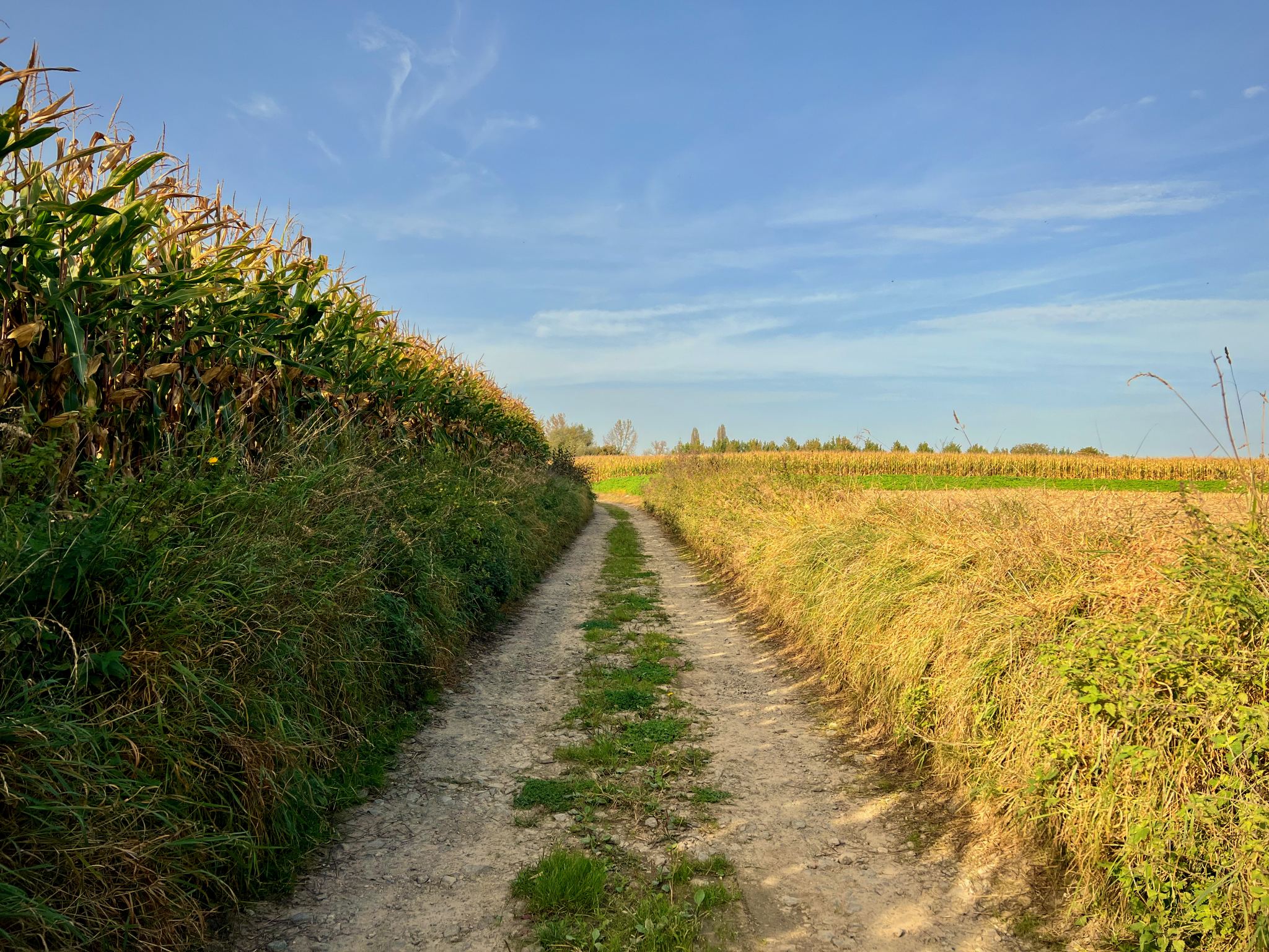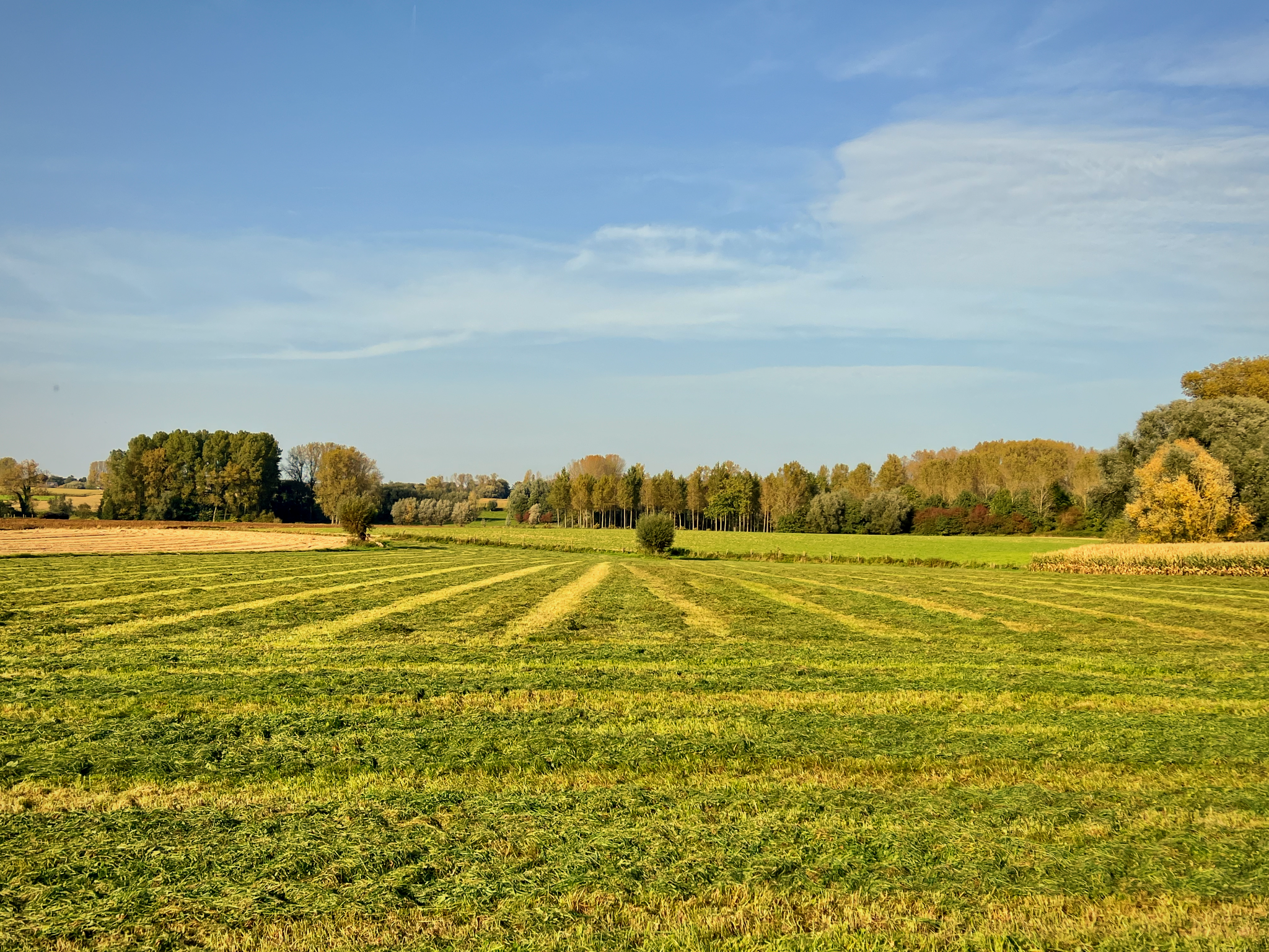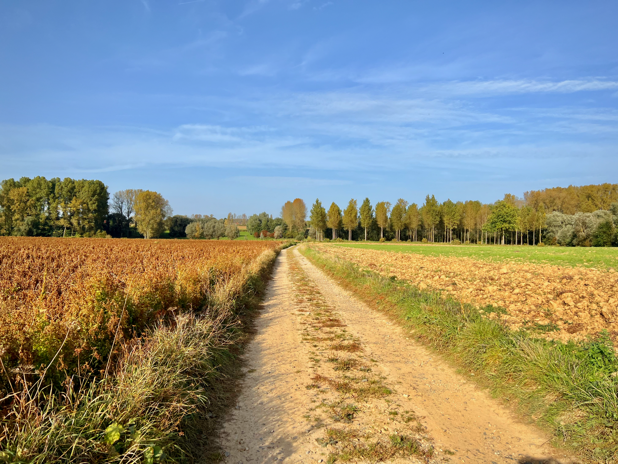 De Stiltewandeling Zuid vat je dus aan op het marktplein van Galmaarden, waar niet alleen enkele horecagelegenheden zijn maar ook een bakkerij gespecialiseerd in heerlijke mattentaarten (bakkerij Van Belle). De eerste ± 600 m van de wandeling, een aanloopje naar de eigenlijke lus, o.a. via een buurtweg, geeft je al een klein beetje een idee van wat je verder mag verwachten: glooiende agrarische landschappen. De route is normaal gezien ongeveer half verhard en half onverhard, maar door opgebroken straten is dit momenteel anders. In ieder geval, ook vanop de verharde stukken (lees: smalle, vaak holle plattelandswegen) is het ongeremd genieten van de prachtige panorama’s.
