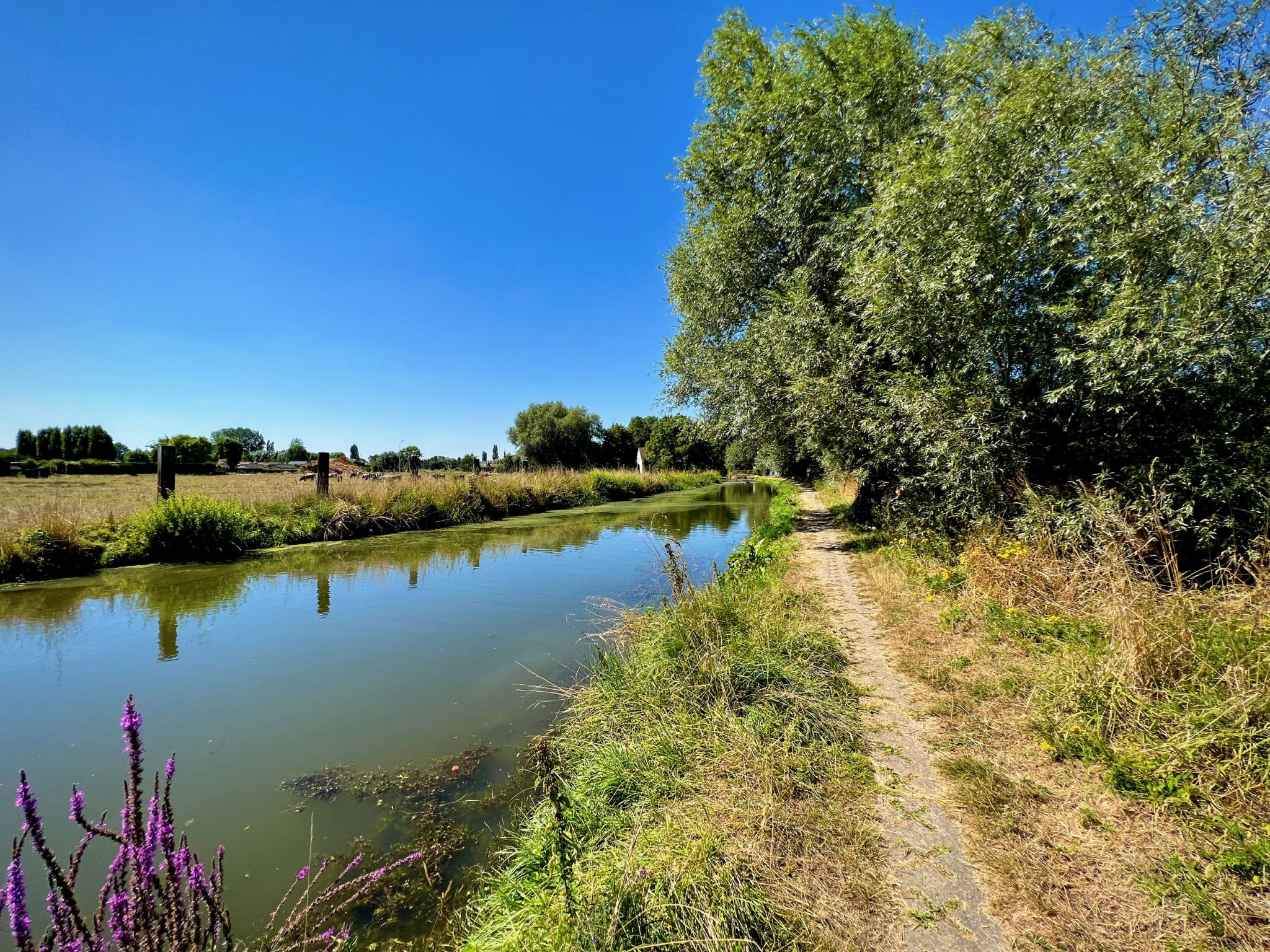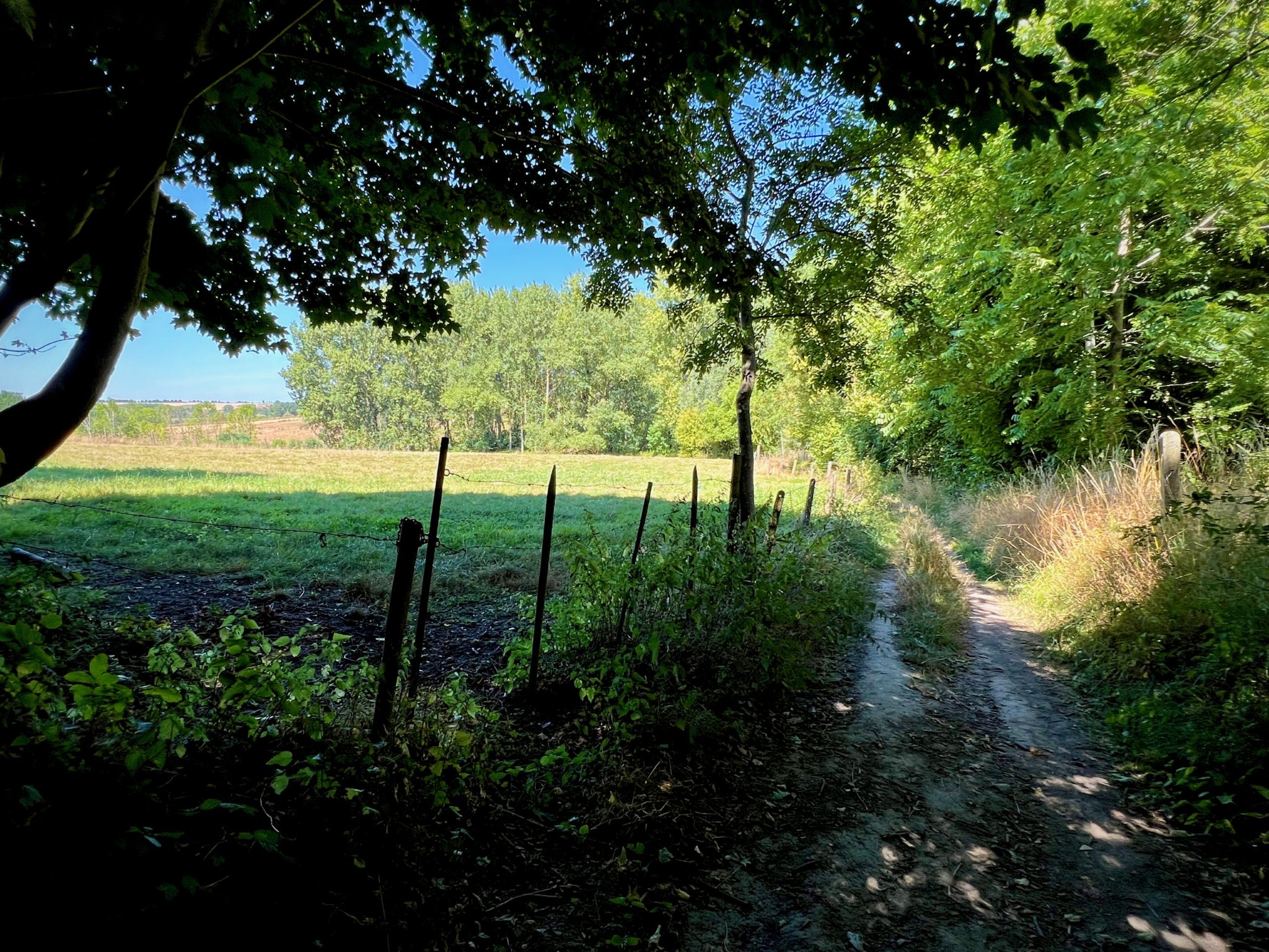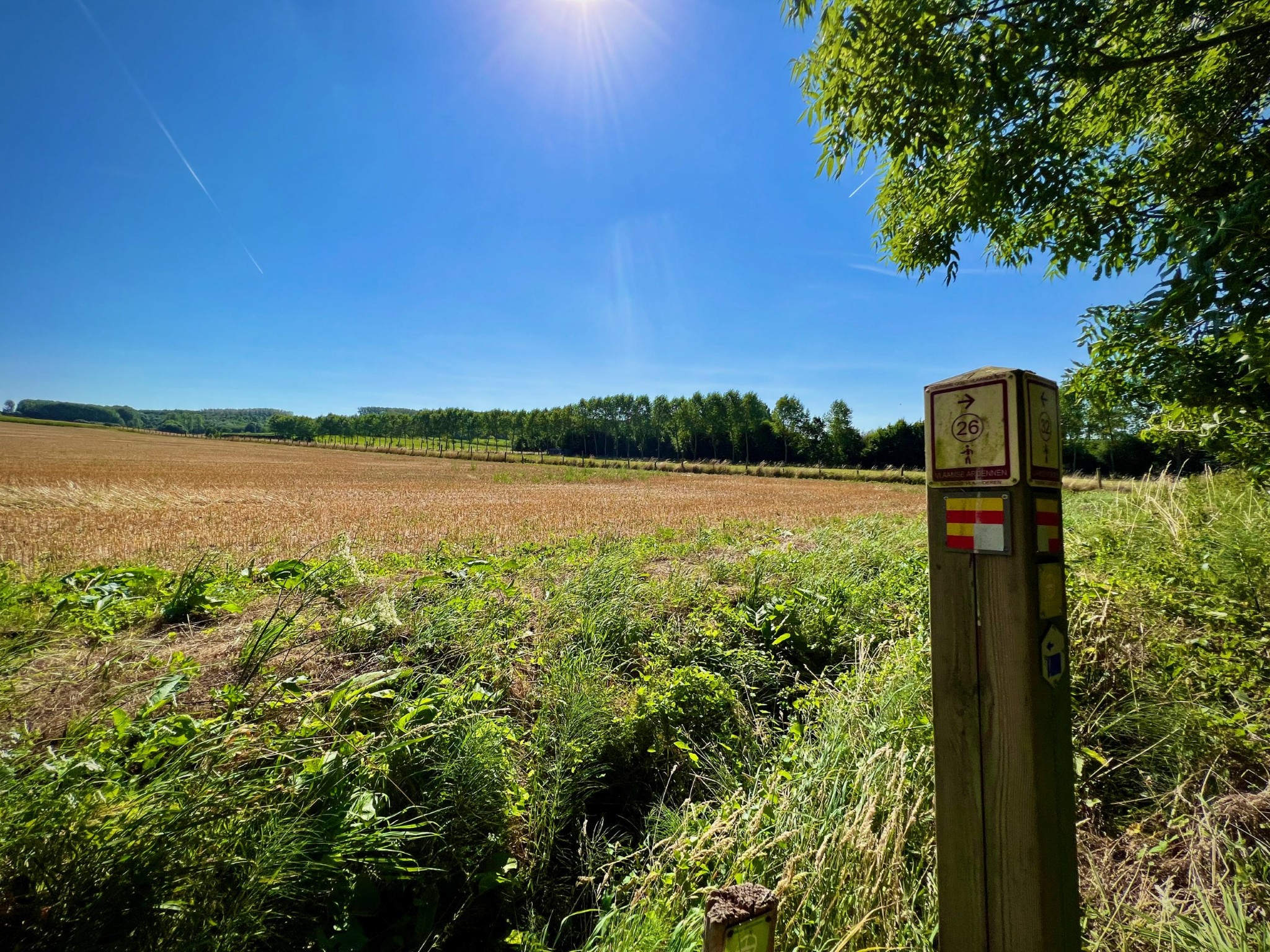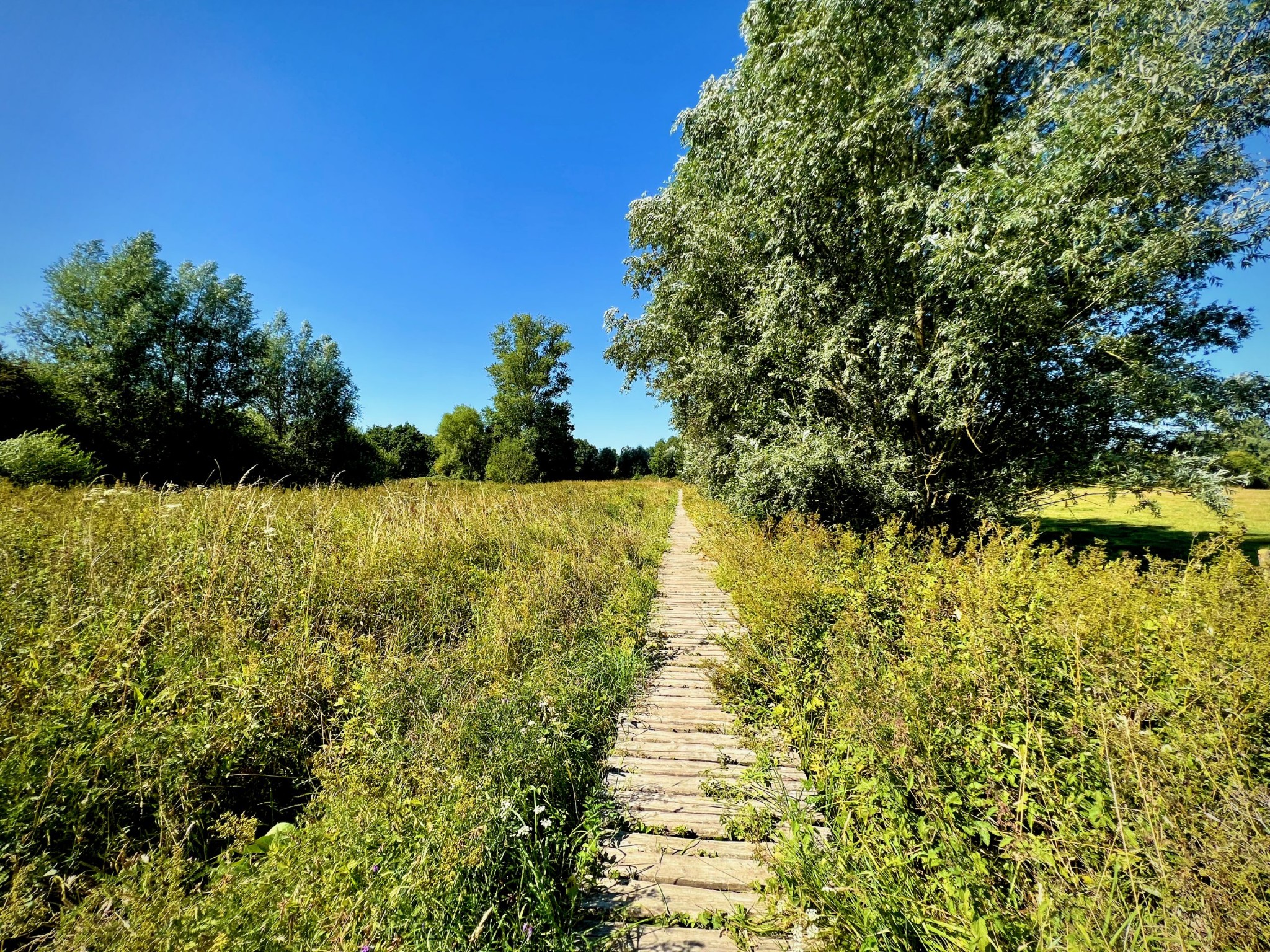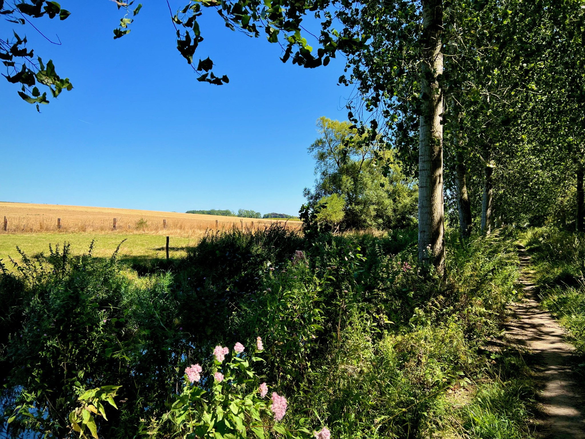 Natuurgebied Middenloop-Zwalm bestaat uit verschillende deelgebieden (Rozenhoek, Vossenhol, Jan de Lichte, Jansveld …) waarvan je er een groot aantal aandoet op de treinstapper tussen Lierde en Munkzwalm. Het landschap van de vallei, die regelmatig overstroomt, bestaat uit een groen lappendeken van beekdalbossen, graslanden en moerassige gedeelten met hier en daar vlonderpaadjes. Die laatste vond ik natuurlijk heerlijk — ook al waren ze met dit kurkdroge weer overbodig — maar wat me vooral zal bijblijven van deze mooie wandelroute zijn de stukken langs verkoelende bossen.