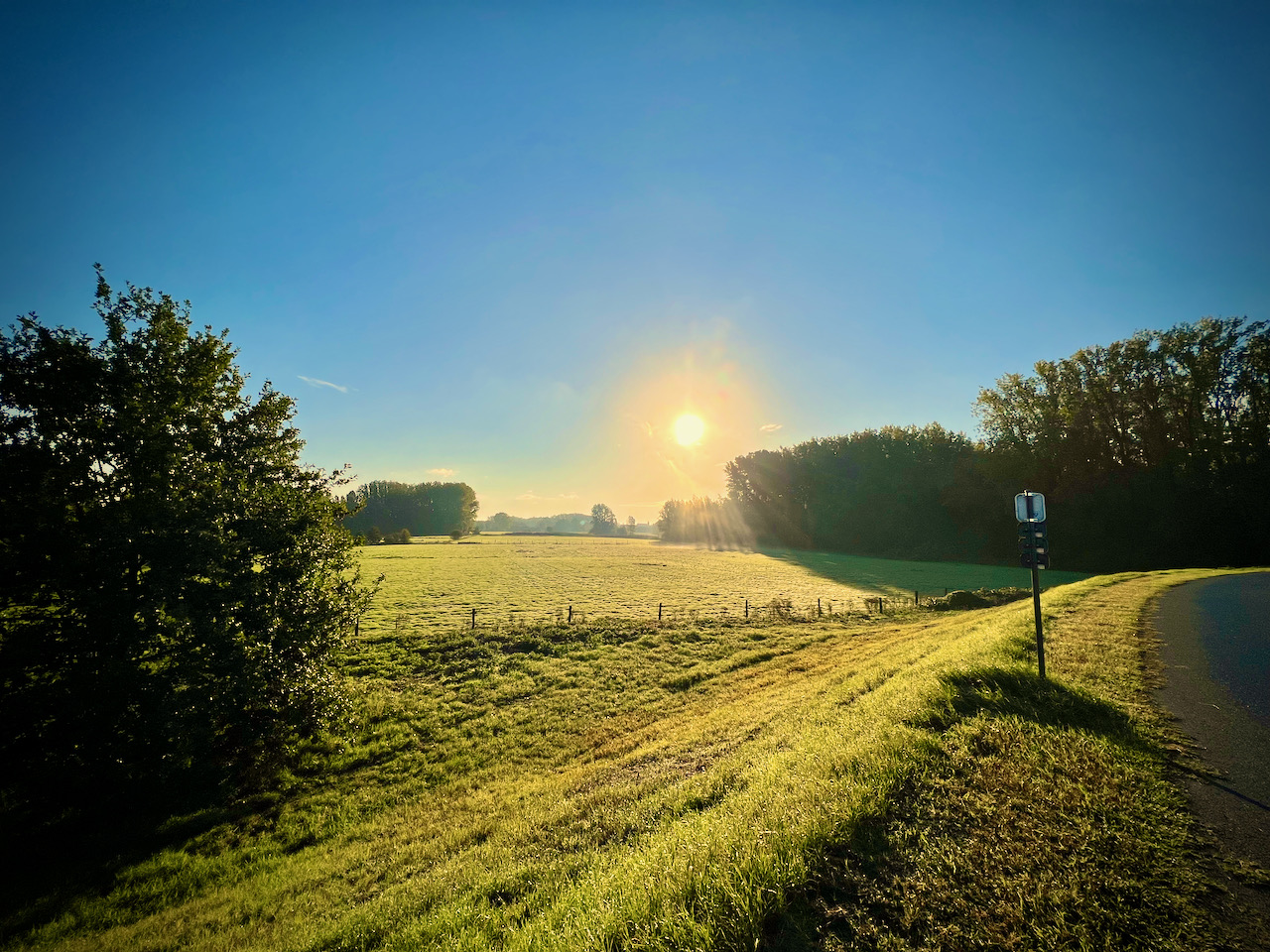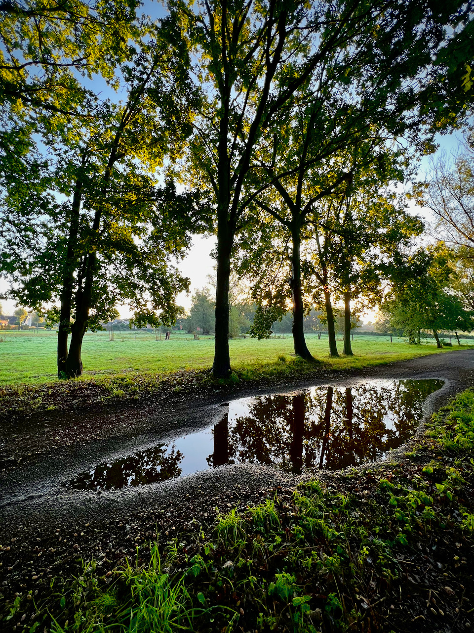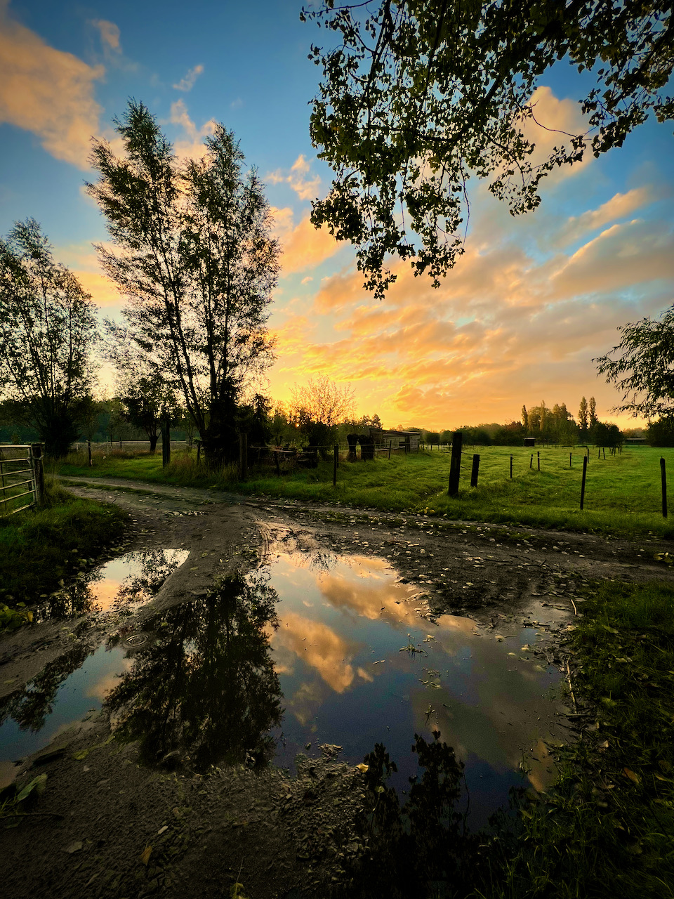 Het eerste knooppuntenbord vond ik wat verder en bracht me, met een explosie van kleuren onder de opkomende zon, meteen in de sfeer. Ik wandelde langs akkers en veeweiden via modderige paden die de eerste zonnestralen meesterlijk weerspiegelden. Echt onbetaalbaar!