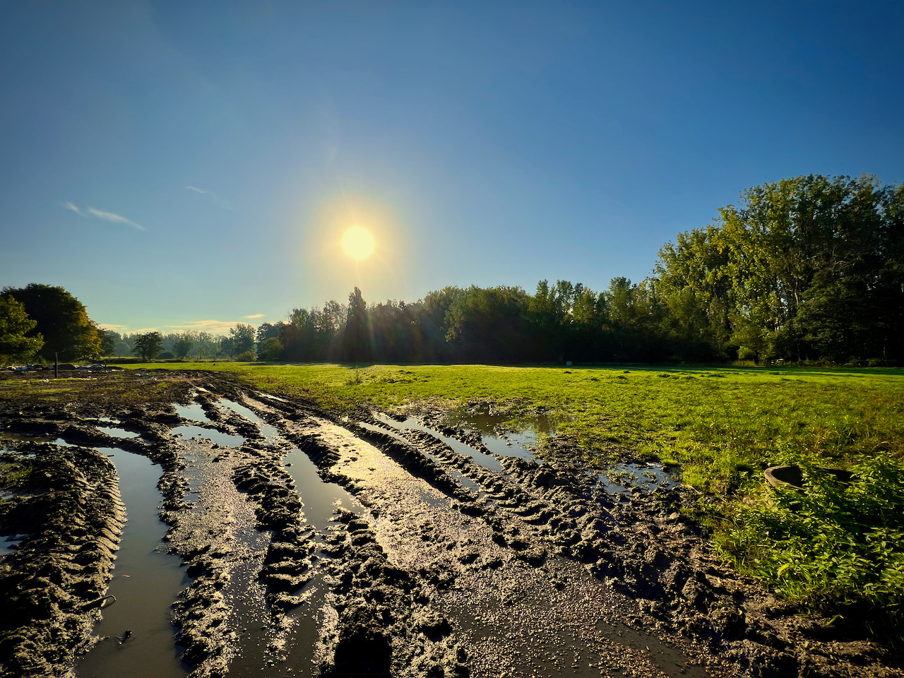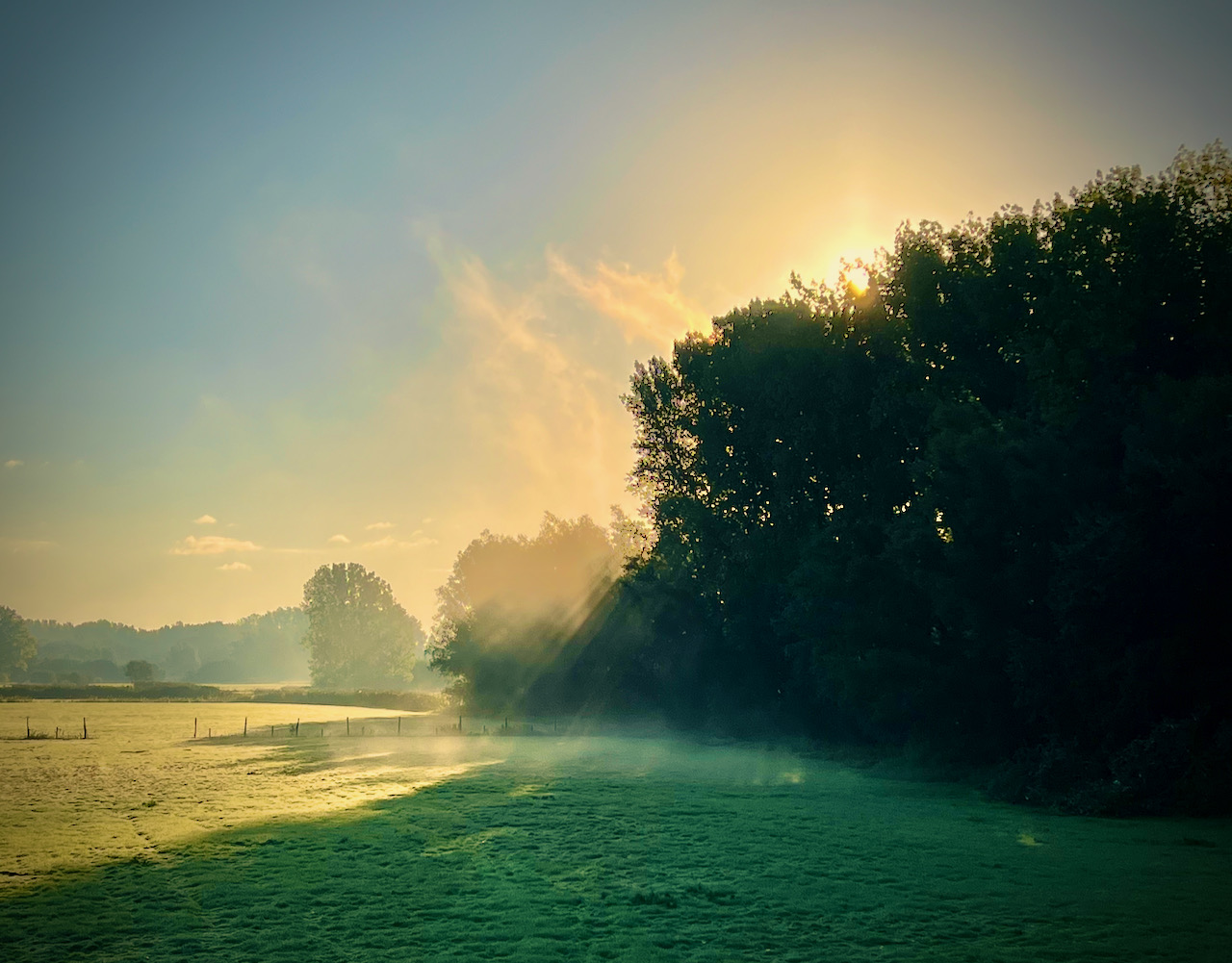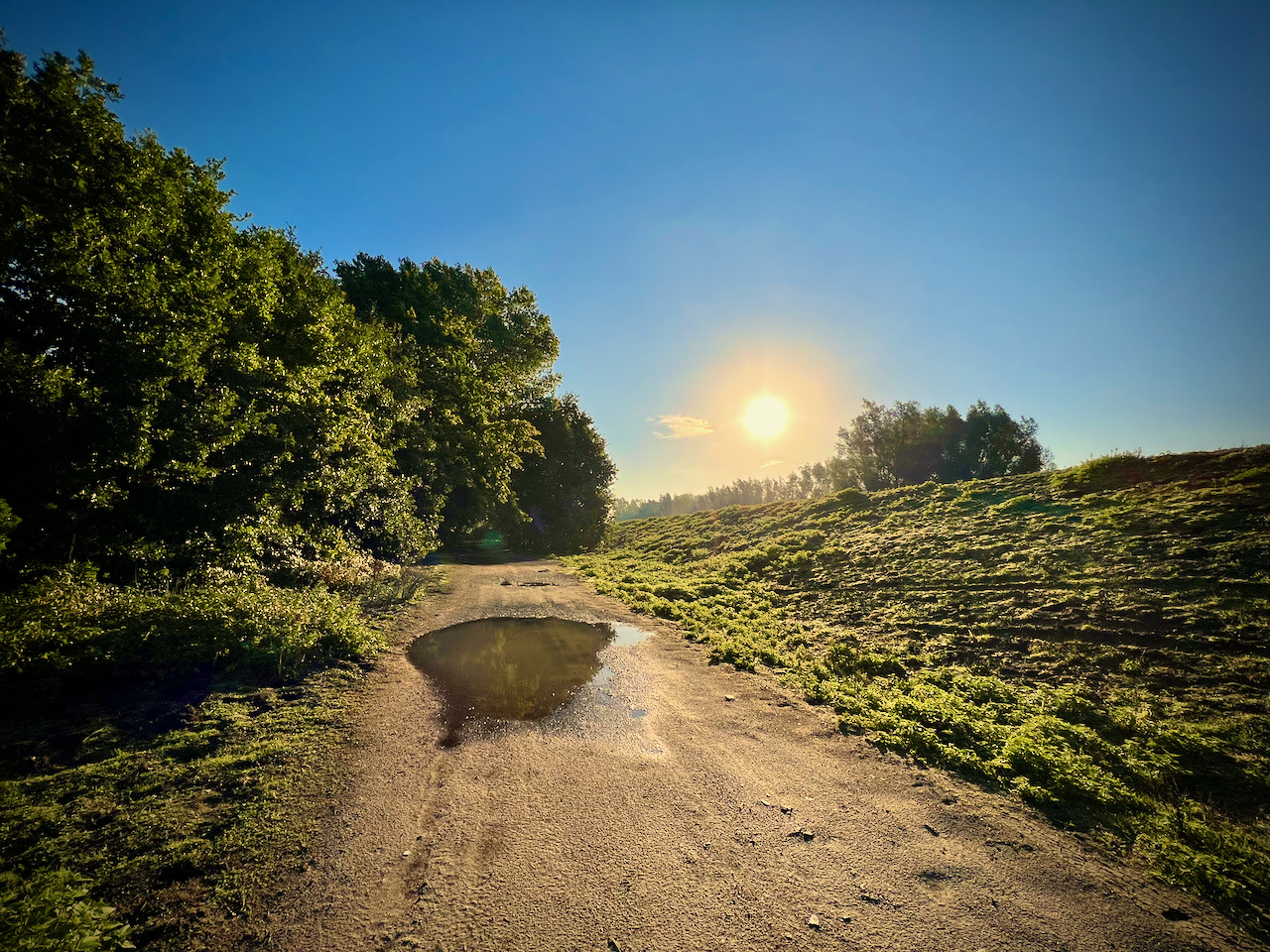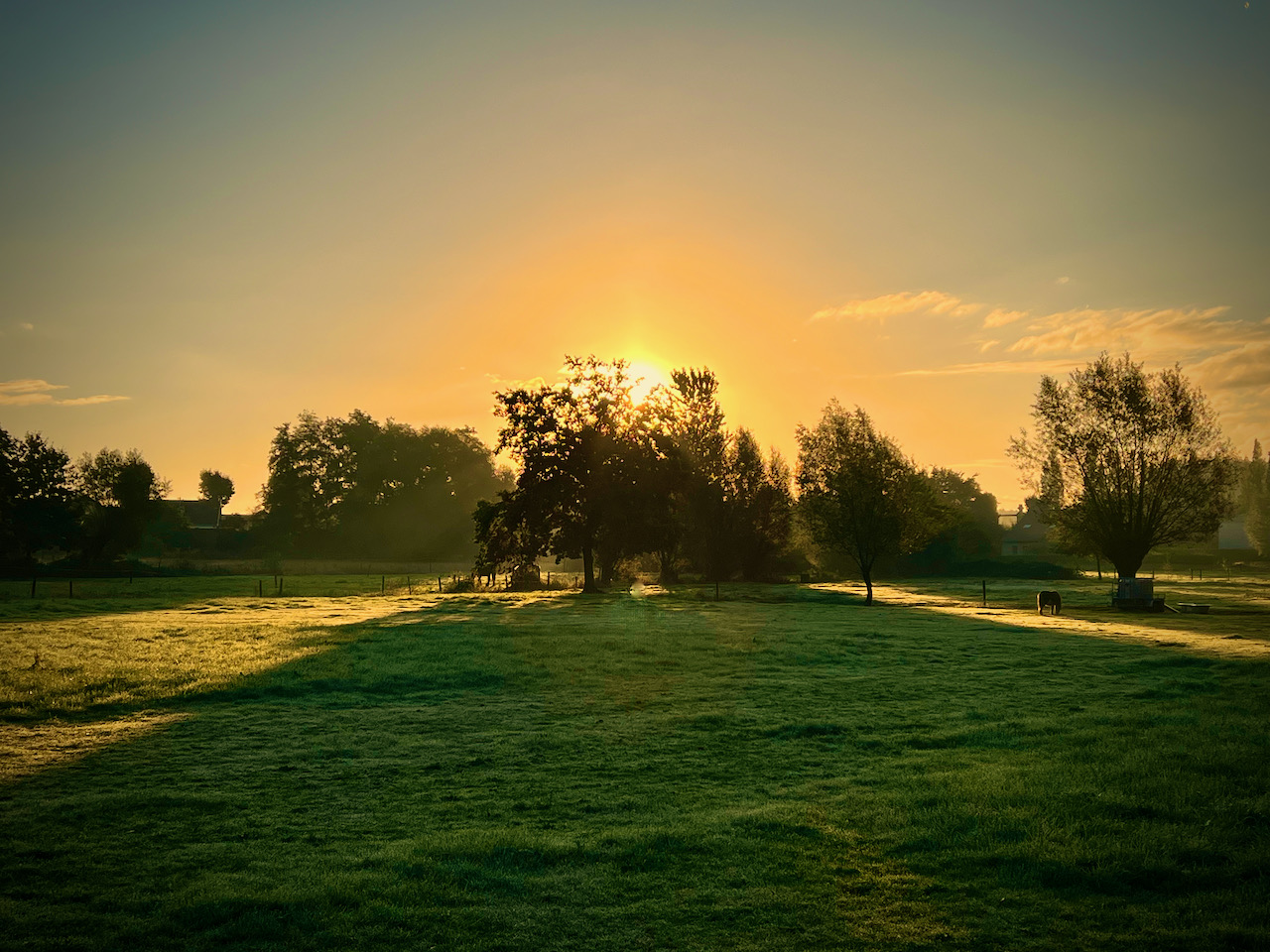 Het eerste knooppuntenbord vond ik wat verder en bracht me, met een explosie van kleuren onder de opkomende zon, meteen in de sfeer. Ik wandelde langs akkers en veeweiden via modderige paden die de eerste zonnestralen meesterlijk weerspiegelden. Echt onbetaalbaar!